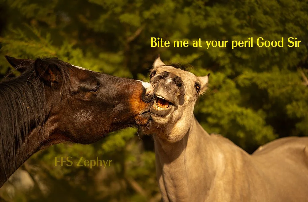 I finally line up the perfect shot of my glorious golden horse, coat sparkling in the sunlight, standing with his ears forward, looking as majestic as I have ever seen him, I adjust my camera settings for the artistic blur of Zephyr’s Mother (Merls) in the background and, concentrating on the negative space surrounding the horses, I click the shutter …